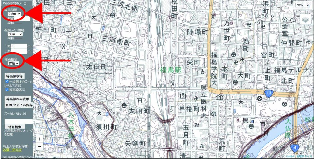 デフォルトでは等高線の間隔が10mになっているため、画面左側の設定パネルで「等高線間隔」を「0.5m」に、「描画精度」を「高精度」に変更します。
