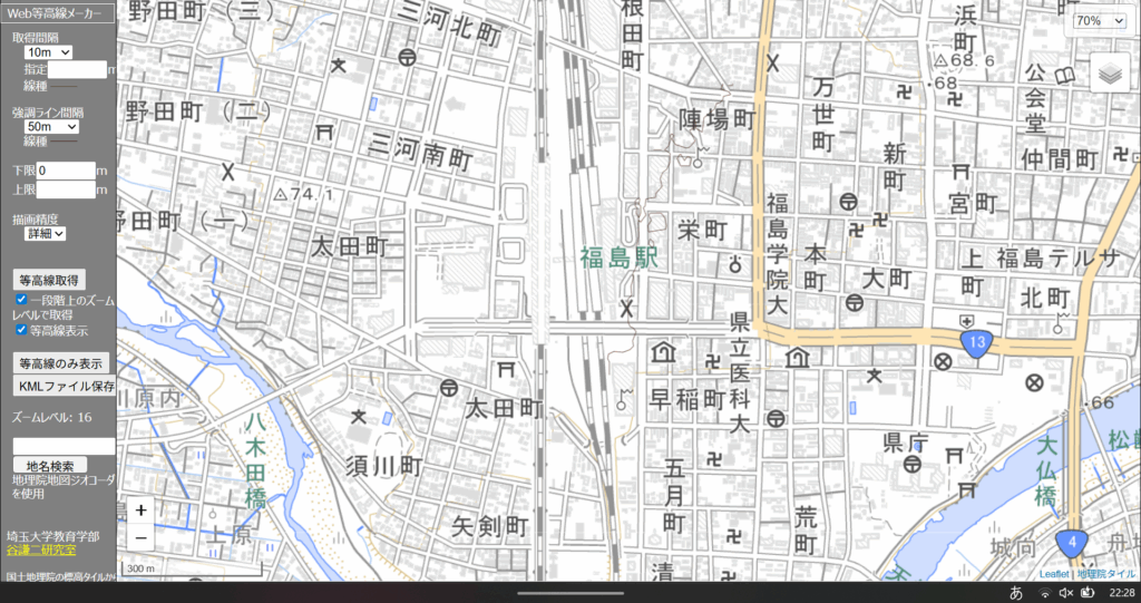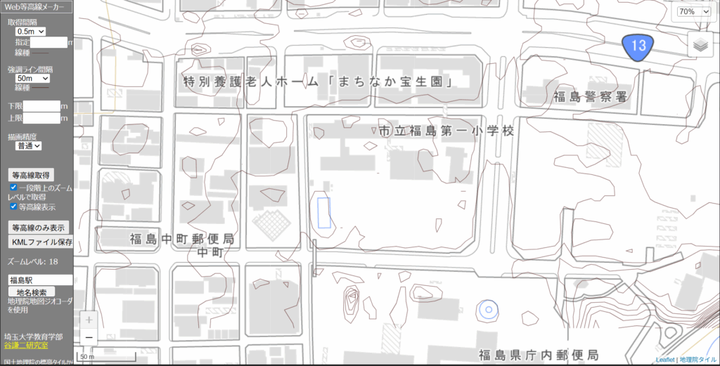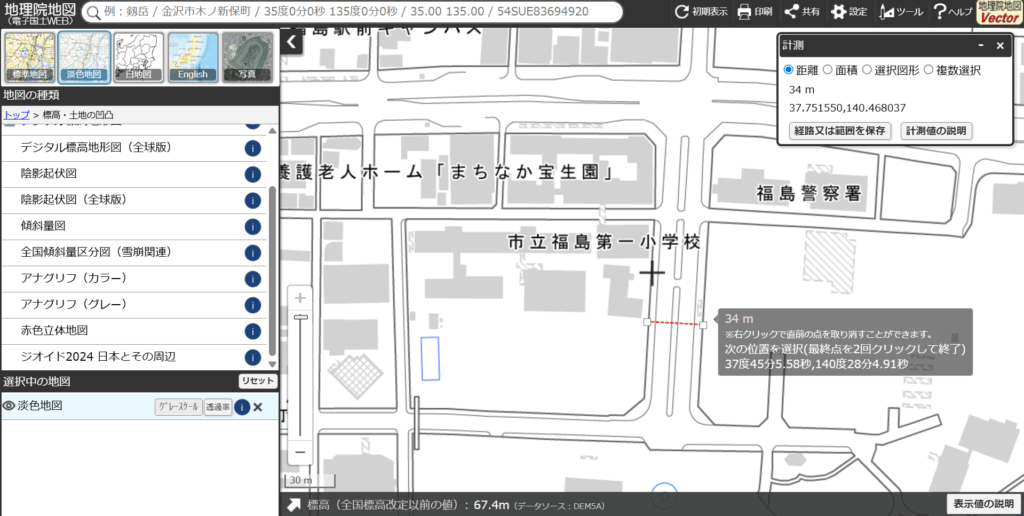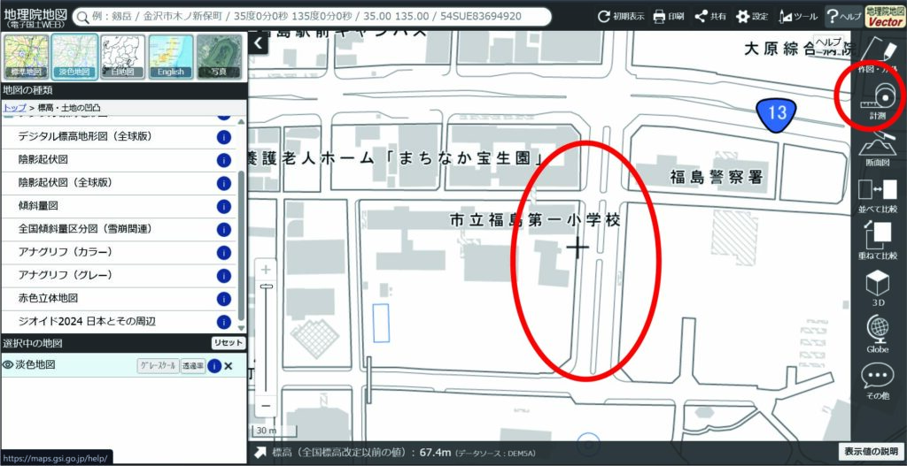 まず、地図上で長さが分かりやすい場所を探します。道路の幅員、建物のファサード長、公園の敷地境界など、後で正確な長さを測定できる直線部分を見つけましょう。今回は、国土地理院の「地理院地図」を使い、「福島市立福島第一小学校」東側の道路幅を基準にします。