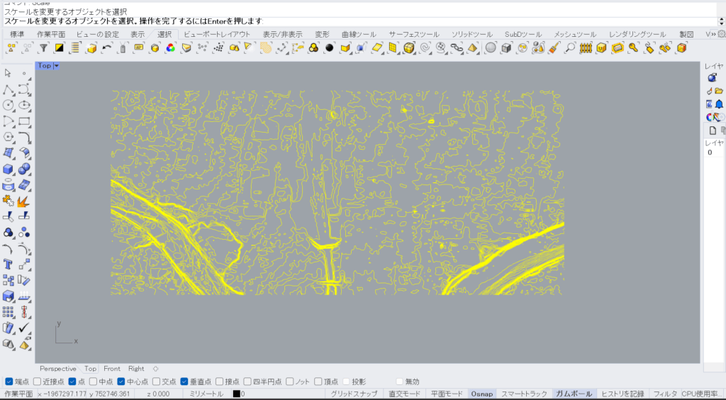 無事に等高線データを開けましたね。ただし、この時点ではまだ2Dの線データに過ぎません。これから正確な3Dモデルにしていくためには、①縮尺を合わせ、②各等高線に正しい高さ(Z軸)情報を与える必要があります。