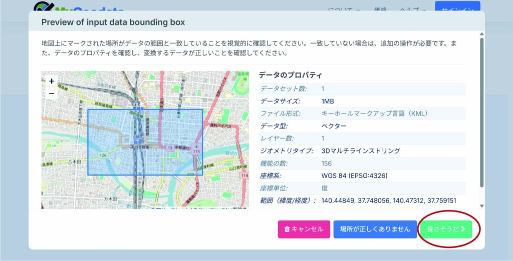 2.ファイルが読み込まれると、地図上にデータの範囲が表示されます。内容を確認して次に進みましょう。